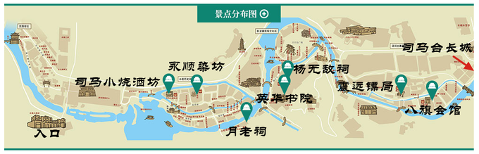 一日游安排(全天游覽 賞夜景):景區大門-雁歸游船碼頭-司馬小燒酒坊-司馬缸酒樓-永順染坊-皮影戲館剪紙店-英華書院-山頂教堂-楊無敵祠-水鎮美食街-湯河賽橋-龍鳳池溫泉-鎮遠鏢局-震遠鏢局-八旗會館-司馬臺長城-城上溫泉館-音樂噴泉-湯市街