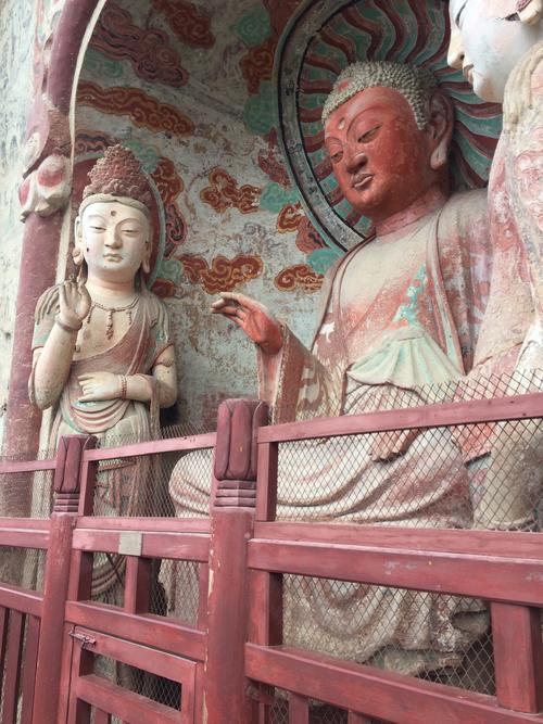 麥積山的洞窟很多修成別具一格的“崖閣”。在東崖泥塑大佛頭上15米高處的七佛閣,是我國典型的漢式崖閣建筑,建在離地面50米以上的峭壁上,開鑿于公元6世紀(jì)中葉。麥積山石窟雖以泥塑為主,但也有一定數(shù)量的石雕和壁畫。麥積山石窟被列為國家重點(diǎn)文物保護(hù)單位,新架和修復(fù)了1300多米的凌空棧道,使游人能順利登臨所有洞窟。麥積山石窟的造像最高大者達(dá)16米,最小者僅為10余厘米。其中第44窟造像被日本人稱為“東方的維納斯”。西秦的78窟 、128窟的造像的僧衣細(xì)致地繪出了圖案。建于七十余米高的的七佛閣上塑像俊秀,過道頂上殘存的壁畫精美絕倫,其中西端頂部的車馬行人圖,無論從哪個(gè)角度看車馬所走方向均不相同,堪稱國內(nèi)壁畫構(gòu)圖之經(jīng)典之作。