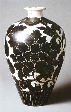 磁州窯以生產(chǎn)白釉黑彩瓷器著稱于世,黑白對比,強(qiáng)烈鮮明,圖案十分醒目,刻、劃、剔、填彩兼用,并且創(chuàng)造性地將中國繪畫的技法,以圖案的構(gòu)成形式,巧妙而生動(dòng)地繪制在瓷器上,具有引人入勝的藝術(shù)魅力。它開創(chuàng)了我國瓷器繪畫裝飾的新途徑,同時(shí)也為宋以后景德鎮(zhèn)青花及彩繪瓷器的大發(fā)展奠定了基礎(chǔ)。