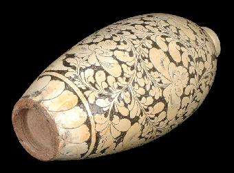 磁州窯品種諸多,以白地黑花(鐵銹花)、刻劃花、窯變黑釉最為著名。它的裝飾技法突破了當(dāng)時(shí)流行的五大名(官)窯(汝、官、鈞、哥、定)的單色釉局限,運(yùn)用了數(shù)十種豐富多彩的裝飾技法。1998年3月,元代的磁州窯黑釉剔花玉壺春瓶從英國追回。