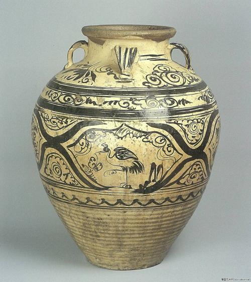 布局上以傳統(tǒng)的中國畫寫意手法結(jié)合圖案變化特點(diǎn),畫面既簡潔又生動(dòng)。同時(shí)還借鑒其它姐妹藝術(shù)的有益經(jīng)驗(yàn)來豐富自身的裝飾,尤其是金銀器、漆器和織繡工藝對磁州窯的彩繪均有一定程度的影響。