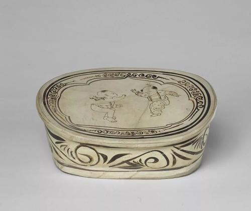 描述:枕呈腰圓形,枕面前低后高。白釉,枕面及枕側(cè)以黑彩繪嬰戲紋。枕面外周以雙線勾勒如意形開光及雙弦紋,開光與弦紋間飾四組卷枝紋。枕側(cè)繪簡單的花草紋。枕面主題紋飾畫筆簡練,描寫兩個(gè)嬰孩玩耍,其中一孩兒頭上落一只小鳥,孩兒驚愕不已,另一孩兒作興奮狀,欲上前捕捉小鳥。