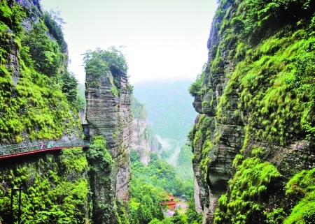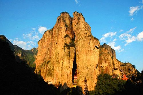 靈峰是雁蕩山的東大門。東來的游客一抬頭就能看到蒲溪西邊那叫做接客僧的巨巖,接客僧是雁蕩山中形象最為逼真生動同時也最具象征意味的肖物擬人景點,它把我們導入一種佛教的氛圍,這種氛圍在危樓九疊的觀音洞里達到了頂點。靈峰四周諸多青峰蒼崖迂回盤旋,7繞出一方如夢如幻的勝景。剪刀峰又最會做態,“移步換形”,尤其在月夜,真真幻幻的山景會令人生出許多遐想。“雁蕩冠天下,靈巖尤絕奇。”靈巖被視為雁蕩山的“明庭”。