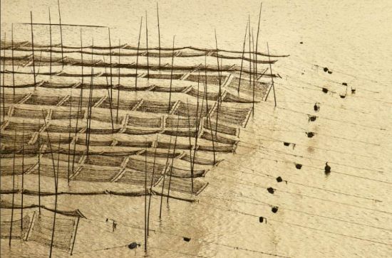 拍攝貼士:北岐的拍攝點位于高高的山崖邊,視野十分開闊,遠處有山,緊挨著腳下的山崖就是灘涂和紫菜架。一排排環形的向對面那座高高的海島聚集。日出的方向,紫菜排之間有明顯的環形灣道,當有適時的光線和漁船出現時,將十分完美。北岐的灘涂是著名的虎皮沙灘,只要有光線,很容易反射出金色的紋理和蜿蜒的小溪。因為這里是拍攝大點,很容易請到當地漁民做攝模,所以200以上的長焦也很重要,且要時刻準備好抓拍。如果想拍些不一樣的角度,可通過那條山道向后走,還可以一直下到沙灘上,沙灘離紫菜排很近,可以拍到不同尋常的紫菜養殖場景。沙灘上還有很多結滿了硬硬的牡蠣殼的礁石,側逆光中可以拍到浪潮拍案中海岸。從停車的地方也可以下灘涂,有個小碼頭,近岸邊經常停靠不少正在裝卸貨的漁船,和已經被廢棄的舊船。就靠你的創作靈感來發揮了。運氣好,灘涂上面還有勞作的人們和飛翔的白鷺。