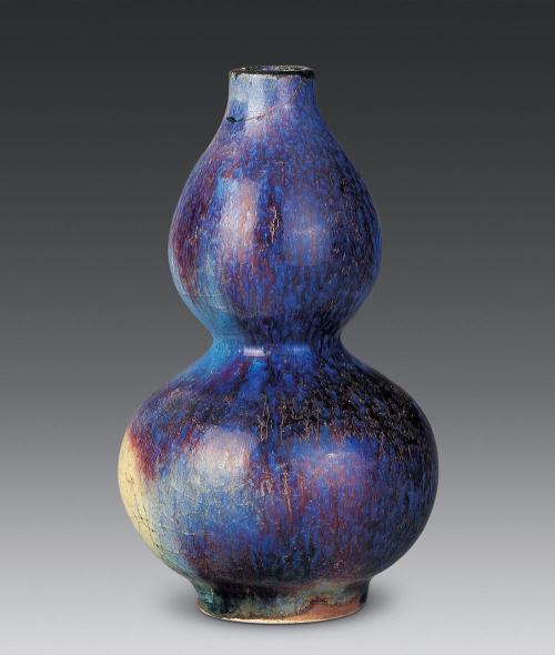 窯變釉是一種藝術釉,變化最多,色彩最豐富,形態也最復雜。它的最初出現完全是偶然的。人們按一定的配方,制成某些釉料,施于制品入窯焙燒后,產生了出乎意料之外的顏色和形態,鈞窯的釉色基調是青色,偶然有在青色中出現或深或淺的紅色或紫色來,而這種紫色,有時像云后迸射出萬道霞光,有時像萬里晴空飄浮的彩云,變化無窮。人們對此現象無法解釋,就稱之為窯變。在長期實踐中,瓷工逐漸認識并掌握了銅紅的成色技藝。鈞窯的瓷工是首先運用銅紅工藝的,這說明當時已經能充分掌握銅元素的還原技術,這是瓷藝史上的一項重大成就。鈞窯不僅開創了我國窯變釉瓷器的先河,而且鈞窯器物的成型和高超的燒窯技術,一直為后世贊嘆不已。