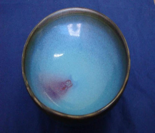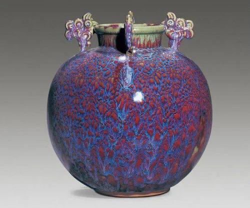 由于釉色的相互交融而產生的無數顏色不一、形狀各異的窯變,是構成鈞瓷區別于其它青瓷的另一個特色。鈞釉中的紫色引人注目。各種紫色是紅釉與藍釉互相融合的結果。鈞釉的紫斑在工藝上是將青藍色的釉上有意涂上一層銅紅釉所造成的。后人對鈞瓷的紫色的評價極高,近人劉子芬在《竹園陶說》中說“鈞窯器一枚,價值萬金┅┅宋時紫色如熟透之葡萄,濃麗無比,紫定、紫鈞,其器皆純色。”