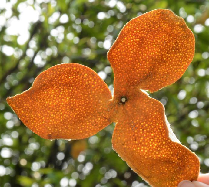 2、廣陳皮:常3瓣相連,形狀整齊,厚度均勻,約1mm,點狀油室較大,對光照視,透明清晰。質較柔軟。