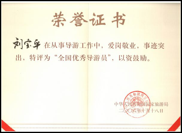 2006年公司董事長劉寶平獲得中華人民共和國國家旅游局授予的“全國優秀導游員”稱號,并受到吳儀副總理的親切接見。全國優秀導游員帶隊管理,相信我們能為您提供最優秀的旅游服務;