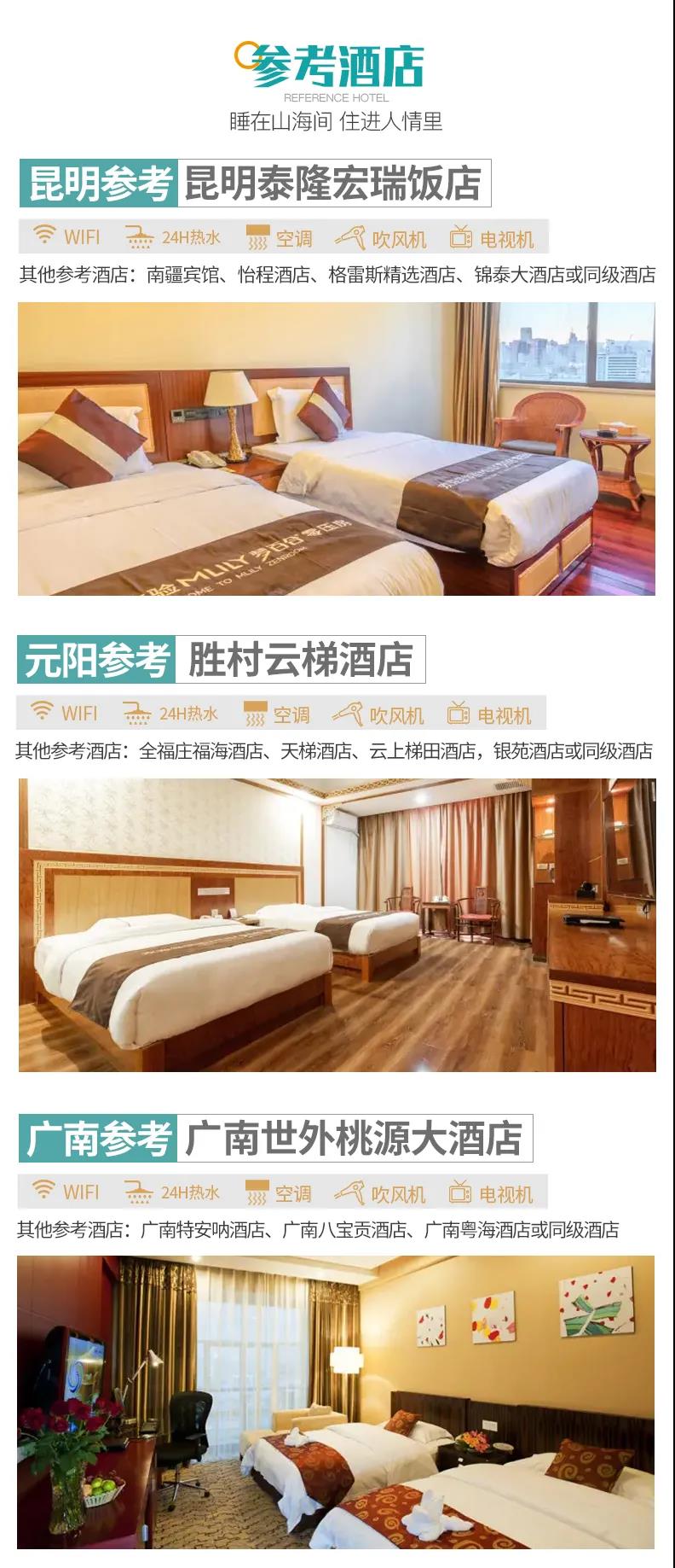 住宿 :行程所列7晚當地酒店標間,并贈送集合日昆明四星酒店一晚。元陽景區酒店標間2晚、廣南準四酒店1晚、彌勒準四星酒店標間1晚、羅平縣三星酒店1晚、普者黑景區精品客棧或酒店1晚(景區內住宿均為攝影農家客棧標準間,不帶星級;因沿途條件有限,如酒店設施達不到您的期望,請您諒解)