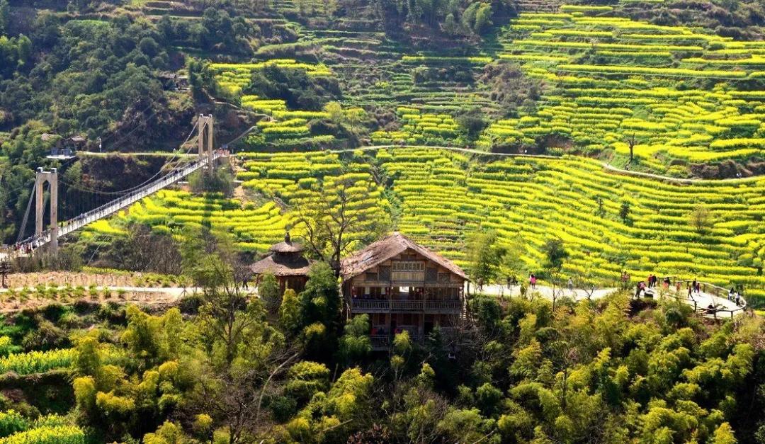 那里漫山遍野的油菜花呈梯田狀,從山頂鋪散到山谷下。