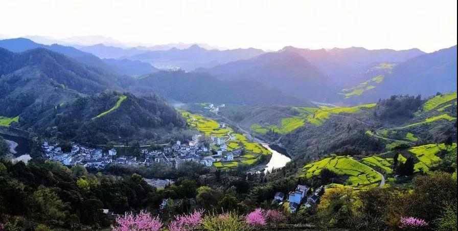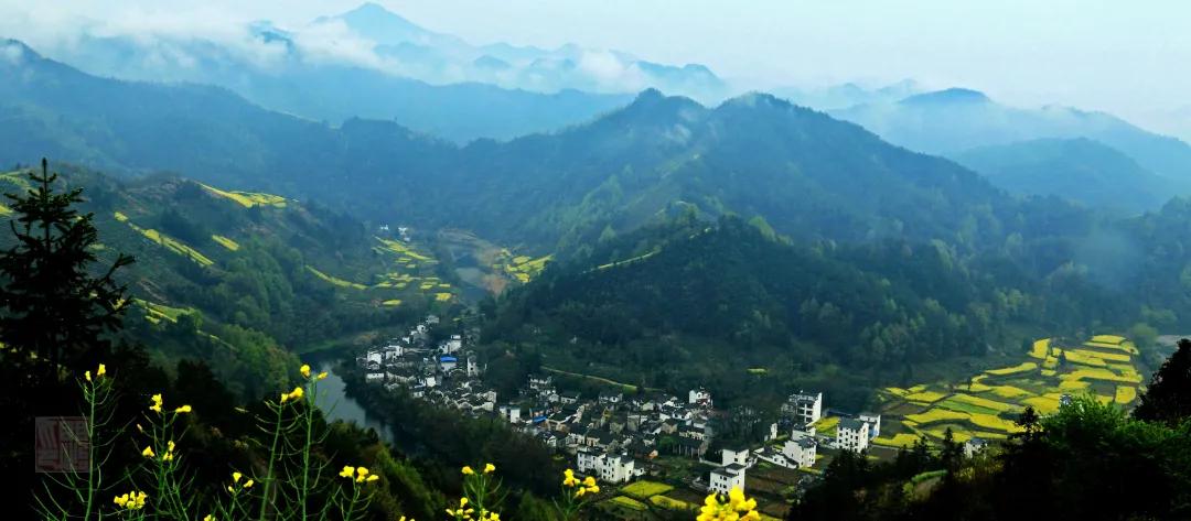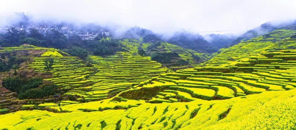 江嶺南臨曉起,東接溪頭,地處婺源縣最東北,是婺源最值得去的地方。站在山頂望去,腳下大片的山谷內,油菜花層層疊疊,一望無際,中間圍攏著幾個小小的村落,黑瓦白墻的徽派民居夾雜在一片金黃之間。