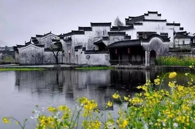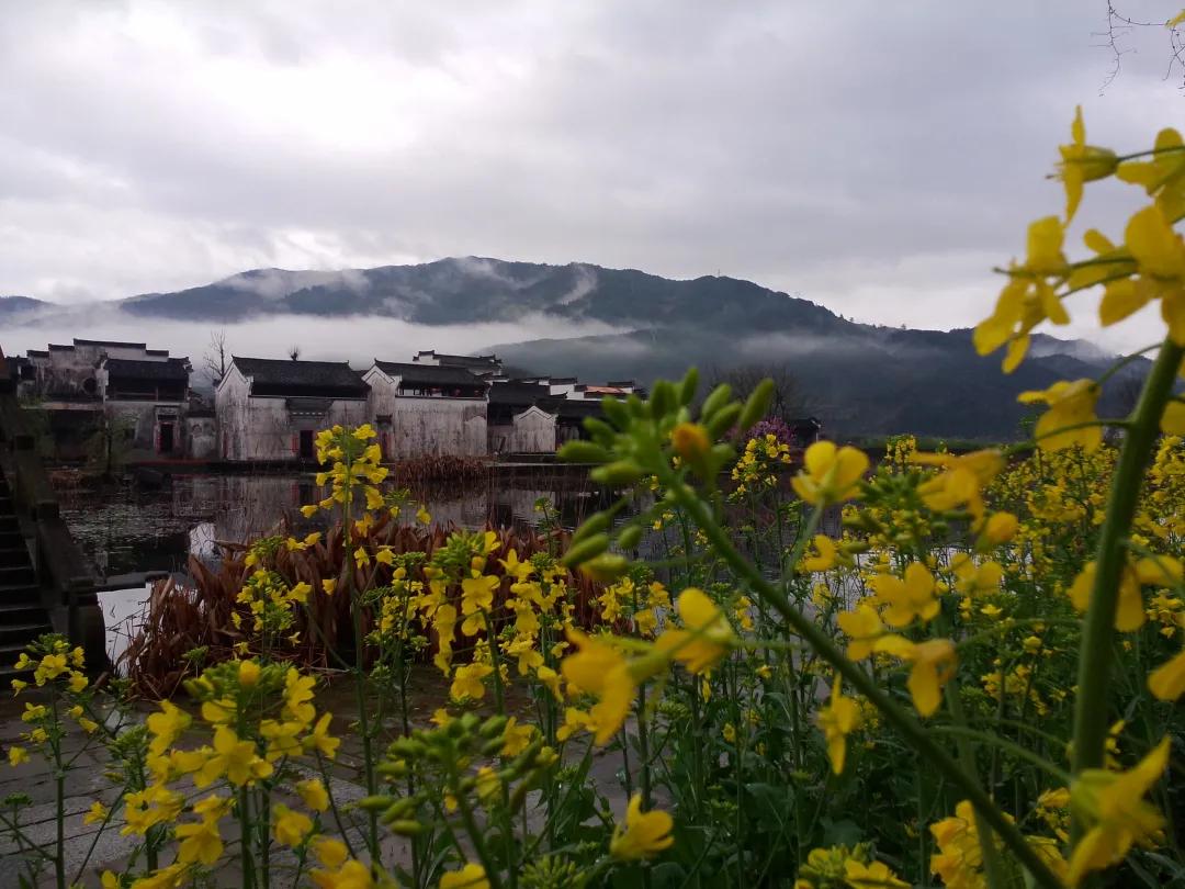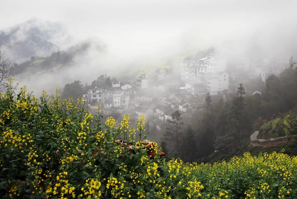 春天來臨時,漫天金黃的油菜花將水墨色的徽派建筑照耀著,白墻青瓦反射著微黃色的光,細看之下,還有幾枝桃花點綴其中。村里裊裊炊煙一直飄到了青色的山上,與山上的煙霧糾纏在一起。這大概才是徽州真正的模樣。