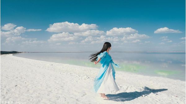 秋冬時的鹽湖凍結成冰,白色的湖面和藍色的天空時畫面的主要色彩;春夏之季,湖水恢復本來的淡藍色面貌。穿衣搭配建議: