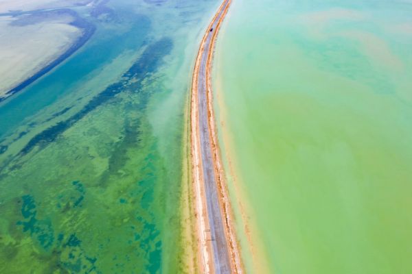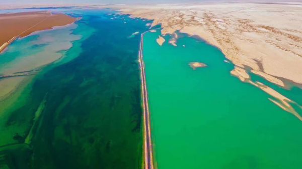 西臺吉乃爾湖俗稱“雙色湖”,此湖被G315國道從中穿過,將湖面分為兩半,一側湖水因富含銅離子而呈現淺綠色,一側湖水因含有硫酸亞鎂而呈深藍色,奇特又漂亮,被戲稱為“鴛鴦火鍋”。