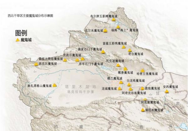 從地圖上我們可以明顯看到,北疆是魔鬼城的主要分布區(qū)域,甘肅、青海也有少量分布,實(shí)際上,在西北資料可查的雅丹地貌群就近百余處,它們一個(gè)個(gè)神秘地屹立在西北疆域上,成為了寂寞荒原上的一場(chǎng)視覺盛宴,數(shù)量之多,形態(tài)之多,就像是一個(gè)神秘而龐大的“魔鬼”家譜,實(shí)際上,它們并不是被人類遺棄或鬼神建造的“古城”,而是經(jīng)過(guò)風(fēng)蝕形成的一種特有地貌景觀,用我的話講就是被風(fēng)吹了多少年的一堆大土丘~可是深入其中,高高低低的“建筑群”投下錯(cuò)亂光影,在這里幾乎看不到任何生命的跡象,因?yàn)殍F含量過(guò)高,磁場(chǎng)不穩(wěn)定, 指南針進(jìn)入雅丹地貌經(jīng)常會(huì)不管用,尤其在夜深人靜,遇到風(fēng)吹,聲音似鬼哭狼嚎,極其陰森恐怖,故被稱為“魔鬼城”。如果晚上在魔鬼城里露宿一夜,想必也會(huì)是一種奇妙的體驗(yàn)~