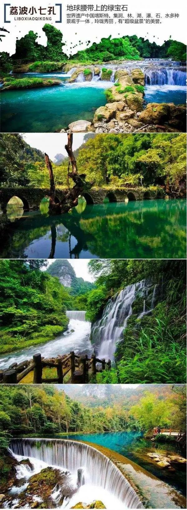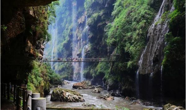 下午:后乘車前往游覽國家 AAAAA 級景區(qū)【大七孔】 (游玩時間不少于 2 小時);大七孔是以原始森林、峽谷、 伏流、地下湖為主體的景區(qū),沿著恐怖峽打狗河直下,可見吊橋,右邊的棧道一面靠山,一邊臨水,蜿蜒曲折,凹凸不 平。最為震撼的還是走過棧道的三分之二處,有一橫跨河兩岸的天然巨巖,是喀斯特是貌奇觀之一,俗稱天生橋,被專 家們譽為 “大自然神力所塑的東方凱旋門”,仰觀橋孔下,只見巨型鐘乳懸掛,橋腳、橋側(cè)的裂隙石縫長出綠石草叢灌木,藤蘿花卉纏裹橋身,真是滿目琳瑯、五顏六色的天然大彩橋。