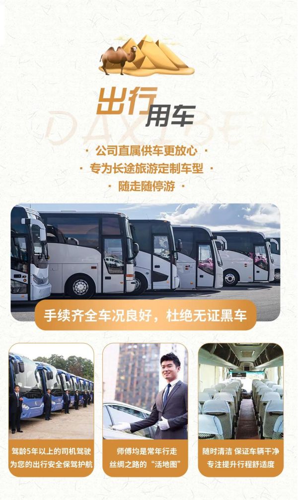 交通:全程正規空調旅游車出行,保證一人一正座位,車型大小根據實際人數安排,且由駕駛經驗豐富的司機為您的出行保駕護航,報價包含車費、油費、停車費、維修費及司機勞務費。