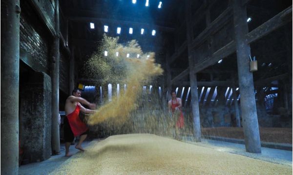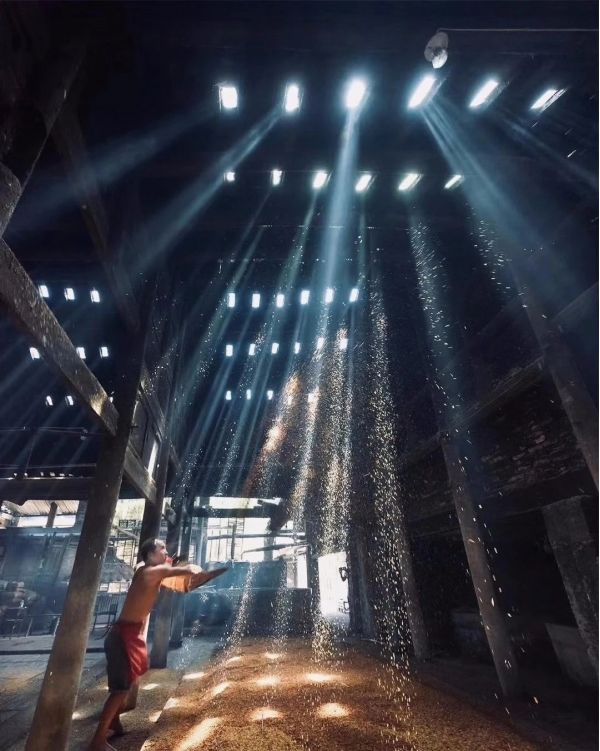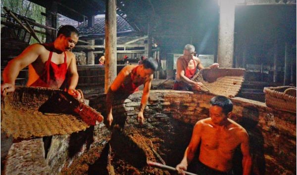 拍攝有著百年歷史的傳統(tǒng)手工藝—泡子酒,迎合著紅高粱霧蒙蒙蒸汽,仿佛置身于行宮騰云般壯觀。烤酒師傅們端著酒糟穿梭行走,或激情揮灑酒曲之間,所到之處,散發(fā)著一種勞動(dòng)之美,力量之美。將近午時(shí)光束穿透老屋頂,投射到古老的作坊,這里便是暈染了熱騰騰的場(chǎng)景。