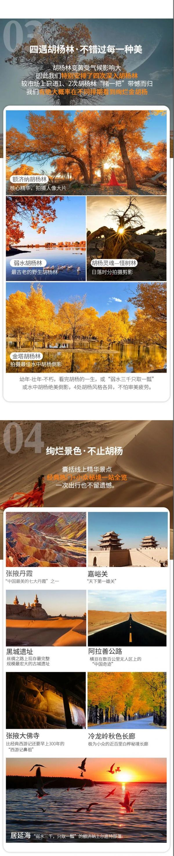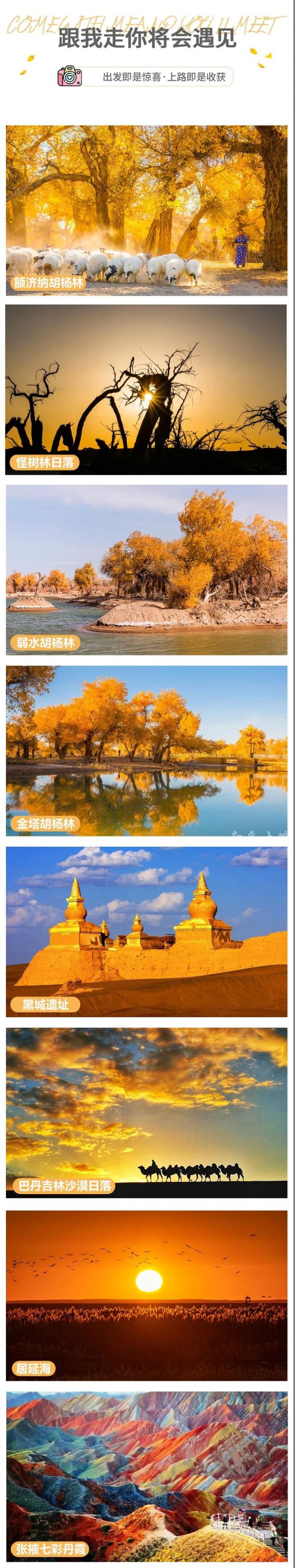 額濟(jì)納胡楊林+冷龍嶺秋色長(zhǎng)廊+金塔胡楊林+弱水胡楊林+怪樹(shù)林+七彩丹霞+居延海日出+沙漠日落+張掖大佛寺+嘉峪關(guān)城樓+阿拉善公路+黑城遺址