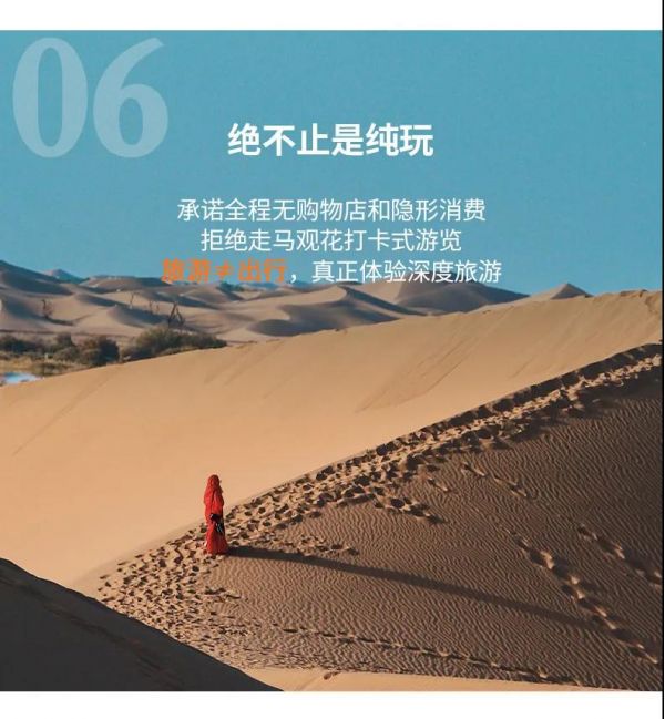 5、甘肅及額濟(jì)納旗環(huán)境受限,當(dāng)?shù)鼐频昙安惋嫍l件無(wú)法與城市相比,請(qǐng)游客做好心理準(zhǔn)備;賓館內(nèi)可能無(wú)牙膏牙刷、拖鞋等一次性衛(wèi)生用品,請(qǐng)自備個(gè)人衛(wèi)生用品;沿途商店較少,民俗習(xí)慣亦有不同,游客可自備咸菜、小吃、干糧等零食,以備不時(shí)之需。