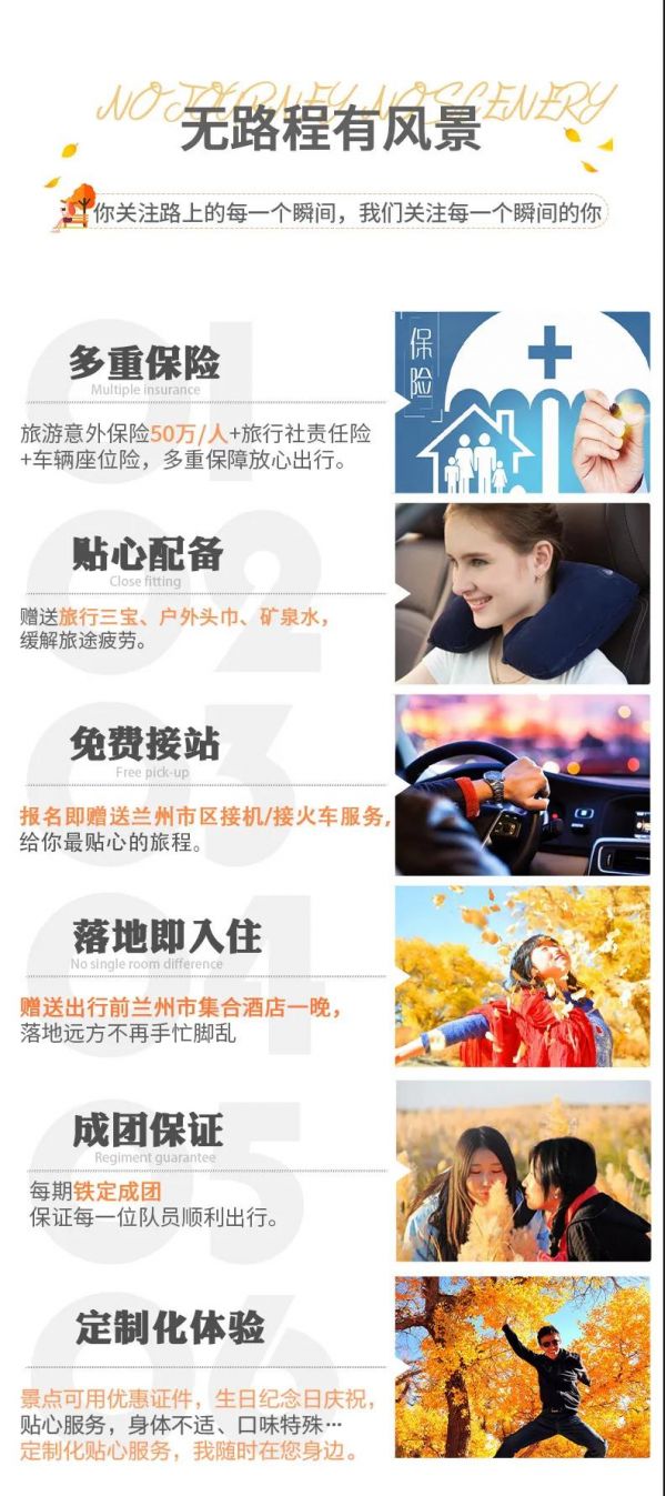 3、贈(zèng)送:貼心禮包戶外百變魔術(shù)頭巾防曬防沙+旅游三寶緩解乘車(chē)疲勞+每人每天一瓶礦泉水;贈(zèng)送蘭州市區(qū)接機(jī)/接火車(chē)服務(wù)(23點(diǎn)后由于運(yùn)管規(guī)定不能接機(jī)/接站);項(xiàng)目不用不退,望您諒解。