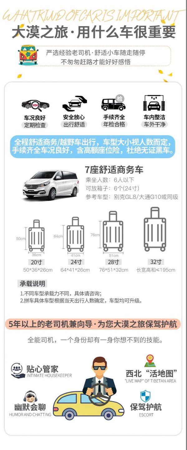 1、交通:2-6人VIP私享小團(tuán),全程舒適商務(wù)車(chē)出行,保證一人一正座位,且由駕駛經(jīng)驗(yàn)豐富的司機(jī)為您的出行保駕護(hù)航,報(bào)價(jià)包含車(chē)費(fèi)、油費(fèi)、停車(chē)費(fèi)、維修費(fèi)及司機(jī)勞務(wù)費(fèi)。
