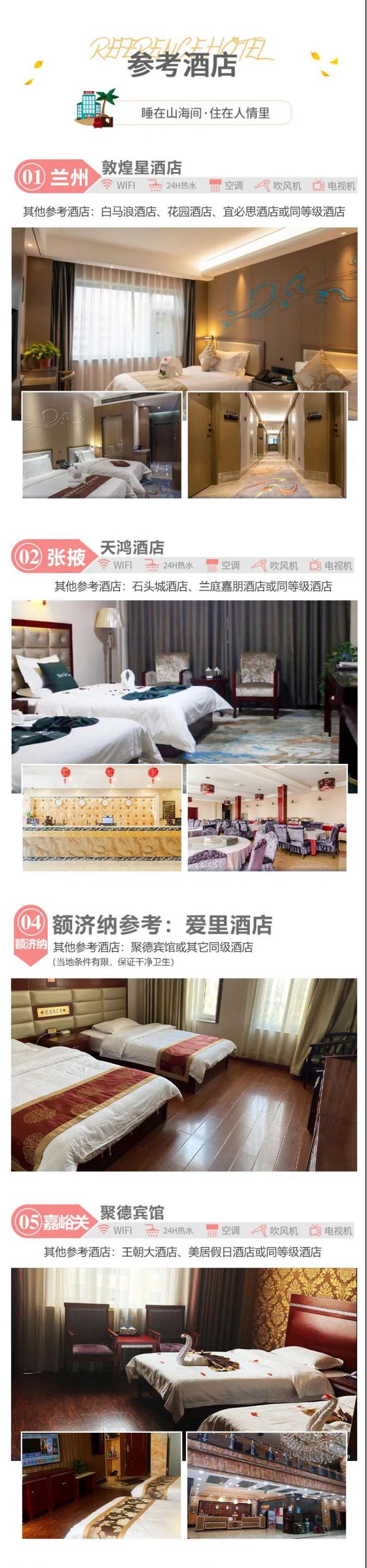 l 蘭州酒店:敦煌星酒店、白馬浪酒店、花園酒店、瀾海溫泉酒店、新勝利賓館、宜必思酒店、星程酒店、河灣麗景酒店或同等級(jí)酒店
