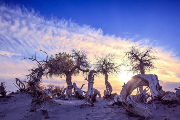 隨后我們游覽約一小時(shí)【怪樹(shù)林】,這里幾十年前是一片原始森林,由于水源不足等自然因素,大面積的胡楊樹(shù)木枯死。如今,枯木東倒西歪,神態(tài)各異,因此當(dāng)?shù)厝朔Q之為怪樹(shù)林。我們將在怪樹(shù)林欣賞大漠落日,看滾滾落日從地平線上姍姍落下,形態(tài)各異的枯枝在大漠上畫(huà)出蜿蜒的影子。