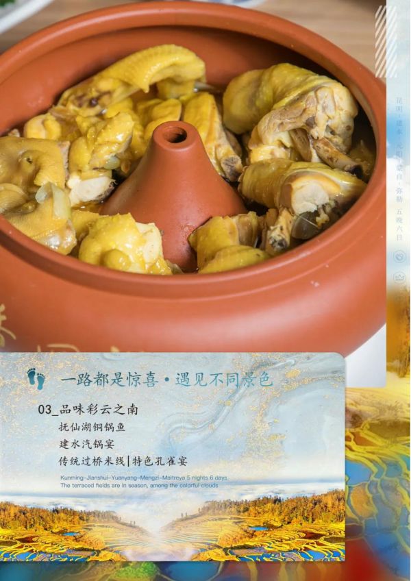 2.餐飲:正餐十菜一湯、(過(guò)橋米線(xiàn)除外)十人一桌,共5早8正; 10人一桌,每桌十菜一湯,餐標(biāo):30元,特色風(fēng)味餐餐標(biāo)40-50元/人。酒店含早。如兒童不占床,需按照當(dāng)?shù)貙?shí)際產(chǎn)生費(fèi)用自理早餐費(fèi)。若客人自愿取消行程中所含正餐,視為自愿放棄,不退費(fèi);