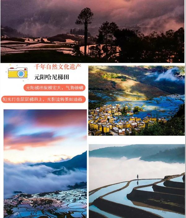 后參觀【菁口梯田】:千年來(lái)哈尼族人民一厘一寸開(kāi)墾耕耘出來(lái)的大地的五線(xiàn)譜。參觀哈尼特色民族蘑菇房,狀如蘑菇,與巍峨的山峰,迷人的云海、多姿的梯田,構(gòu)成了一幅奇妙的哀牢山壯景 。