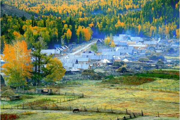 圖瓦人為主,位于阿爾泰山山脈的山谷平地上,與哈薩克斯坦的大山遙遙相望,阿爾泰山上密密麻麻的金黃金黃的松樹林一直延伸到白哈巴村里,村民住的木屋和圈養(yǎng)牲畜的柵欄錯落有致地散布在松林和樺林之中,安寧、祥和 。奇臺江布拉克國家森林公園