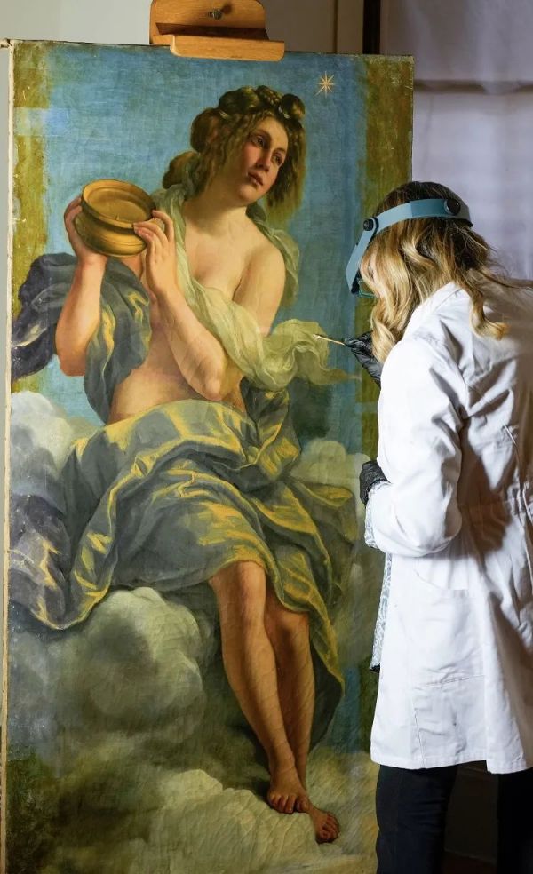 這幅壁畫由米開朗基羅的侄子委托 Gentileschi 創(chuàng)作,描繪一名手捧指南針的年輕女性形象。原始版本中的女性未著衣物,1684年被重繪添加薄紗以遮蓋裸體。本次修復將通過X射線、紫外線和紅外線掃描技術尋找畫家的原始筆觸,嘗試模擬還原出畫作的原貌。