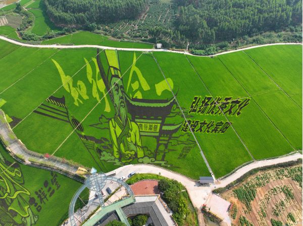 近期,大陸村稻田藝術(shù)景區(qū)迎來(lái)了一批又一批游客。站在觀景臺(tái)上俯瞰,右邊稻田藝術(shù)畫的主題是“文化賓陽(yáng)”,一幅巨大的明朝思想家王陽(yáng)明像映入眼簾,身后則是“賓州南街”以及“知行合一”四個(gè)大字, 展現(xiàn)了賓陽(yáng)五大文化中的陽(yáng)明文化與古城文化。左邊有兩幅稻田藝術(shù)畫,一幅是“如虎添翼”,一只憨萌可愛(ài)的小老虎背著一雙翅膀,寓意大陸村村民祝愿游客“凡事都能如虎添翼”;另一幅是“吉祥三寶”,畫面上是烤著串的牛魔王、拿著手機(jī)自拍的鐵扇公主和忙著給爐子添火的紅孩兒,趣味橫生,這是對(duì)“西游”文化的一種趣味解構(gòu)。