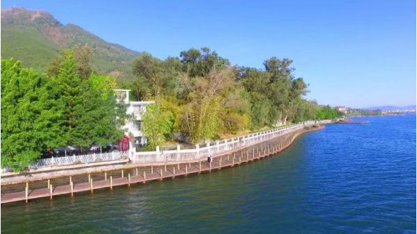 沿著景區內的騎游道一路向南,途經邛海公園和瀘山,來到西波鶴影濕地公園,大榕樹灑下一片陰涼,可以停車坐在樹蔭下休憩,看邛海美景,聽浪聲濤濤。