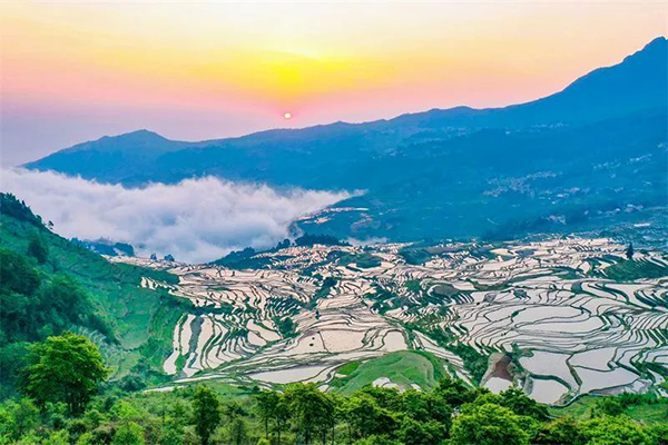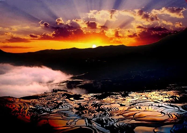 清晨,太陽(yáng)沖破地平線,陽(yáng)光從建水縣雙龍橋的橋孔下穿射而出,宛如油畫(huà)般的場(chǎng)景,就這樣展現(xiàn)在眼前