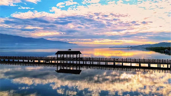 “金光穿洞”如夢(mèng)似幻,絢麗光芒灑在江面上、屋頂上……好像給雙龍橋鍍上了一層溫柔的濾鏡無(wú)盡浪漫。