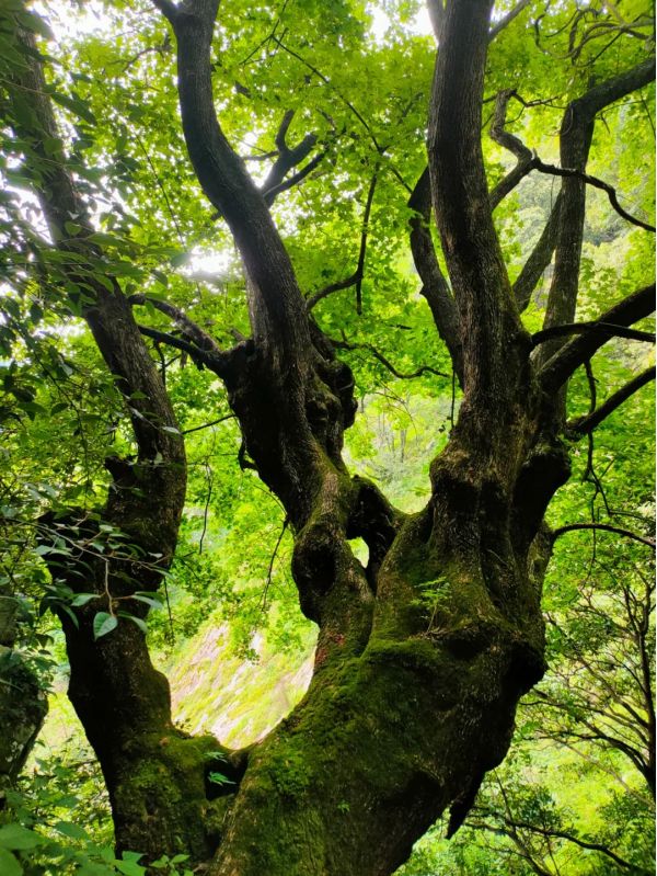 在觀景臺的另一頭,古樹林所在的山頭山巒清秀,山上綠蔭成林,古柏繁茂且分布密集,極目之處,約89棵古樹姿態萬千,枝葉繁茂,樹干布滿青苔好似走進仙境,山野間呈現如美畫景。