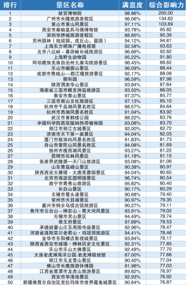 5A級景區(qū)綜合影響力TOP50