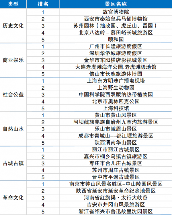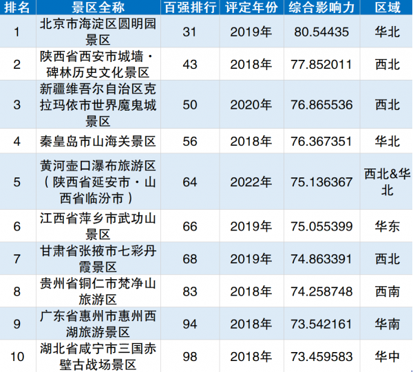 分地區(qū)來看,東北地區(qū)綜合影響力排行榜首為牡丹江鏡泊湖景區(qū);華北地區(qū)的榜首為故宮博物院;華東地區(qū)以黃山風(fēng)景區(qū)為第一位;華南地區(qū)的榜首為長隆旅游度假區(qū);華中地區(qū)的榜首為黃鶴樓公園;西北地區(qū)的秦始皇兵馬俑博物館最有影響力;西南地區(qū)的九寨溝旅游景區(qū)位居榜首。