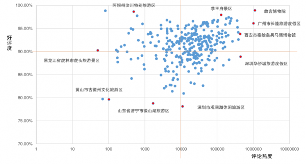 其中,右上象限區(qū)域的景區(qū)是好評度和熱度表現(xiàn)都優(yōu)秀的優(yōu)質(zhì)景區(qū),左上象限的區(qū)域為景區(qū)滿意度較高但熱度稍有欠缺的潛在優(yōu)質(zhì)景區(qū),這些景區(qū)可以著重加強(qiáng)多渠道品牌營銷和媒體宣傳,擴(kuò)大市場影響力。左下象限為景區(qū)熱度和滿意度兩個指標(biāo)都有待發(fā)展的沉默景區(qū),其原因可能一方面是網(wǎng)絡(luò)營銷力度不足,另一方面是現(xiàn)有的景區(qū)游客滿意度也有待提高。右下象限為熱度較高但滿意度較低的問題景區(qū),可以加強(qiáng)對景區(qū)自身管理、設(shè)施及服務(wù)等方面關(guān)注和提升。