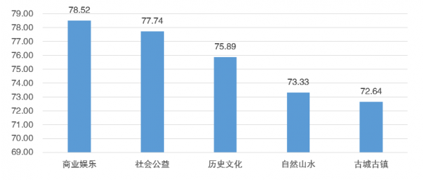 全國318家5A級景區(qū)按照類型可以劃分為歷史文化、商業(yè)娛樂、社會公益、自然山水以及古城古鎮(zhèn)五大類。不同類型的景區(qū)影響力也不同,從統(tǒng)計數(shù)據(jù)來看,商業(yè)娛樂型景區(qū)綜合影響力位列第一,為78.52;其次為社會公益型景區(qū),滿意度為77.74;歷史文化型景區(qū)位居第三,滿意度為75.89。可見游客對于商業(yè)娛樂型、社會公益型、歷史文化型的景區(qū)的熱情都比較高漲。