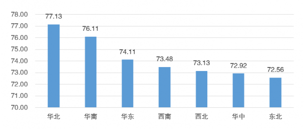 游客對景區(qū)類型有偏好之外,景區(qū)所屬不同地域也表現(xiàn)出了差異。從統(tǒng)計數(shù)據(jù)來看,各地區(qū)整體水平都較高,且差距不大,提升潛力較大。其中華北地區(qū)表現(xiàn)最高,為77.13;其次為華南地區(qū),為76.11;而華東地區(qū)則位居第三,為74.11。東北與華中地區(qū)表現(xiàn)較為滯后。