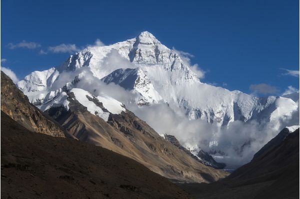 珠峰位于喜馬拉雅山脈中段,山體呈巨型金字塔狀,地形極端險(xiǎn)峻,雪線高度北坡為5800—6200米,南坡為5500—6100米。東北山脊、東南山脊和西山山脊中間夾著三大陡壁(北壁、東壁和西南壁),在這些山脊和峭壁之間又分布著548條大陸型冰川,總面積達(dá)1457.07平方千米,平均厚度達(dá)7260米。珠峰南北坡在7500米以下多冰雪,而北坡和西南坡在7500米以上多碎石。在海拔7500米的高度上,最冷月是2月,平均氣溫-27.1℃,最熱月是8月,平均氣溫是-10.4℃,年平均氣溫是-19.6℃。