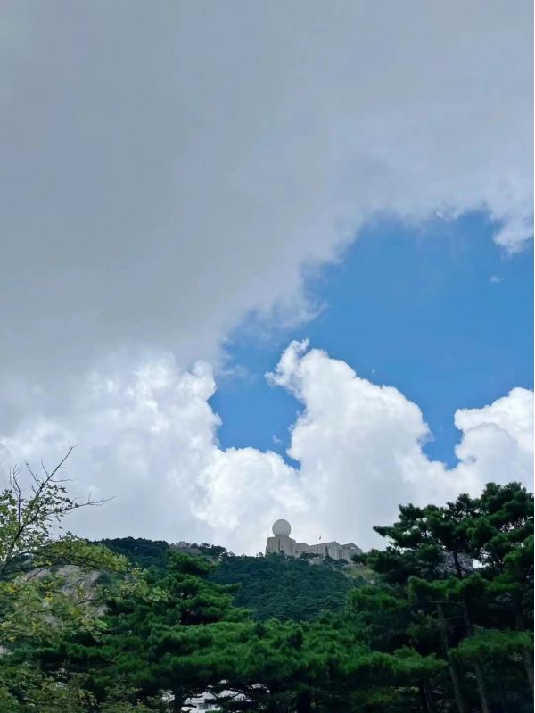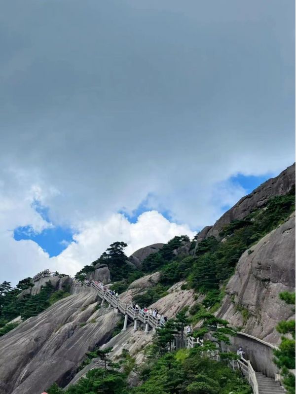 黃山的天氣變化可真快呀!昨天還烈日當空,今天一早起來就烏云密布,一轉(zhuǎn)眼,豆大的雨點就落下來了,我們紛紛穿上雨衣,可還是能感覺到雨大得像是在洗澡。不過,雨中的黃山也別有一番滋味。隔著雨簾,望向遠處,到處煙雨蒙蒙,若隱若現(xiàn)。大霧一會兒把山遮住,一會兒又散開,感覺景色也在不斷變幻。