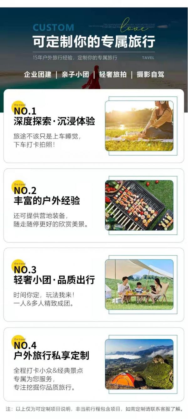 我們業(yè)務(wù)范圍囊括了全國各大城市,川西、西北、新疆,在路上永遠(yuǎn)有我們的身影。我們將為每一個(gè)有定制需求的你策劃出獨(dú)屬于自己的完美旅行。