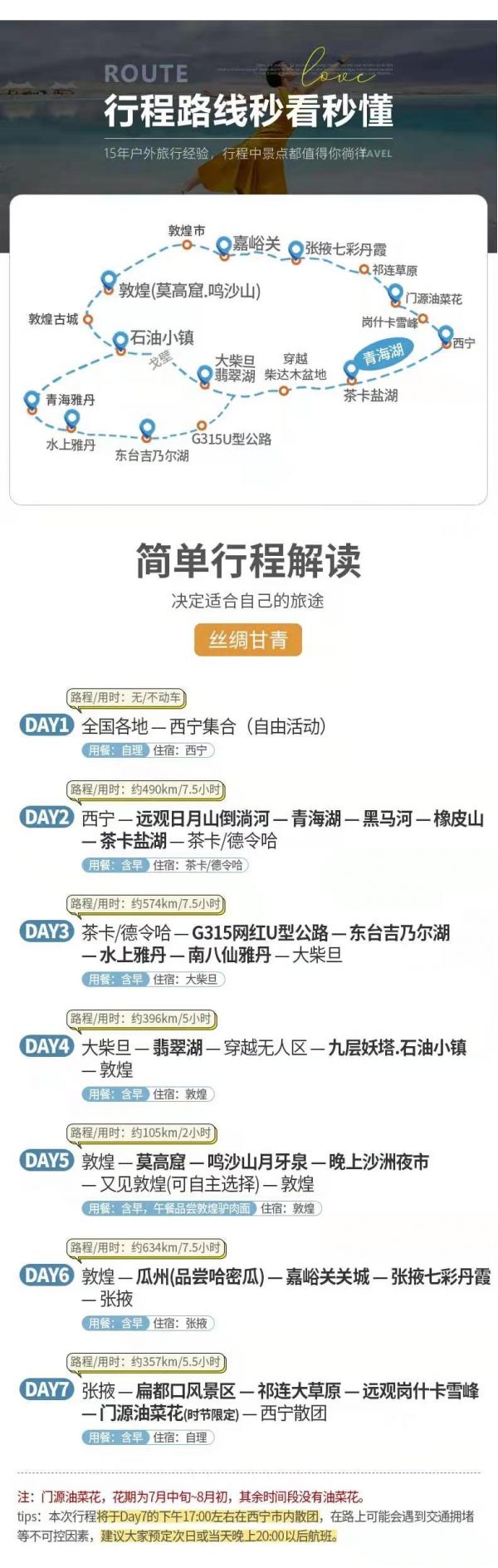 住宿:行程所列6晚住宿。我們會(huì)提供行程內(nèi)展示照片的酒店或其他條件相似酒店,但因沿途條件有限,如酒店設(shè)施達(dá)不到您的期望,請(qǐng)您諒解。西寧:自然里酒店、星程、麗豪、宜必思尚品或其它同級(jí)酒店德令哈:柏菲大酒店、派派、天鴻或其它同級(jí)酒店大柴旦:高原藍(lán)假日酒店、曬北、碧海云天或其它同級(jí)酒店茶卡:星入海、三匯、烏蘭山水、尚客優(yōu)或其它同級(jí)酒店敦煌:賽爾迪酒店、天潤頤和酒店、富麗華國際、禧來敦或其它同級(jí)酒店張掖:柏菲大酒店、派派、天鴻或其它同級(jí)酒店服務(wù):由經(jīng)驗(yàn)豐富的司機(jī)提供向?qū)Х?wù),司機(jī)非導(dǎo)游,不進(jìn)景區(qū),敬請(qǐng)諒解。