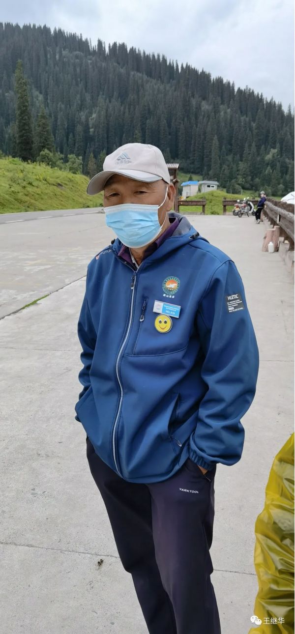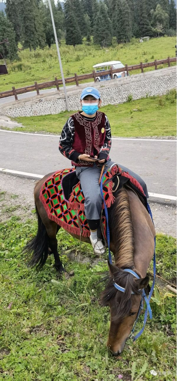 有一個在此休息的導游告訴我們山頂上漂亮可以到山頂上去放無人機,。到山頂有電瓶車票價120。我們6個人包了一輛車,司機叫老張,中等個風吹日曬的黑臉布滿了皺褶。他很熱情主動的介紹山上的情況,開車的時候主動問我們新疆第一大民族是什么民族,我們說是哈薩克,他在前面開著車說:錯。是維族,他又問第二大民族是什么,我們說哈薩克,他得意的說:還是錯,是漢族。他又問第三大民族是什么,我們說哈薩克,他說對了。他又問,你知道那拉提是什么意思,我們說不知道,他說哈薩克語是太陽升起的地方。老張接著自我介紹他也是一個漢族,今年59歲,家在100公里外的公留縣,老婆是一個教師,很漂亮。開私家車來這上班,宿舍就在山下公司宿舍。和山上氈房里的哈薩克牧民都非常熟悉。言語之間露出一些自豪。