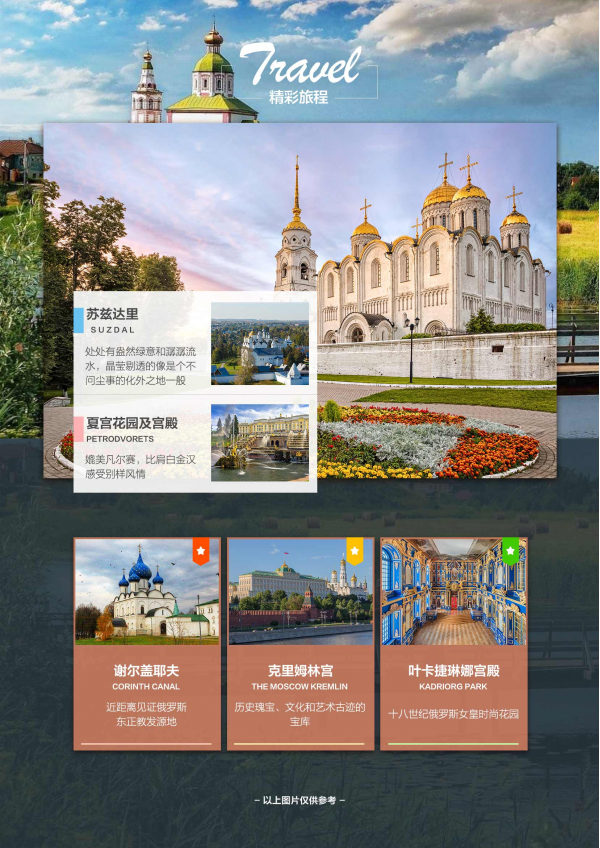 D)夏宮:位于圣彼得堡郊外約 29 公里處。在下花園導游會規定一個集合地點并明確說明集合時間,客人在園內自由拍照 活動。請您務必記住集合時間,按時到規定地點,不要遲到;