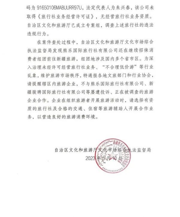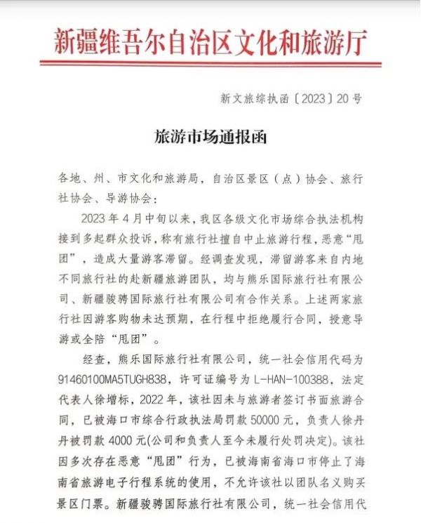 5月11日,新疆維吾爾自治區(qū)文化和旅游廳文化市場綜合執(zhí)法監(jiān)督局發(fā)布通報(bào),熊樂國際旅行社有限公司、新疆駿騁國際旅行社有限公司接待內(nèi)地旅行社赴新疆旅游團(tuán)隊(duì)的過程中,因游客購物未達(dá)預(yù)期,在行程中拒絕履行合同,授意導(dǎo)游或全陪“甩團(tuán)”,已被多次投訴。