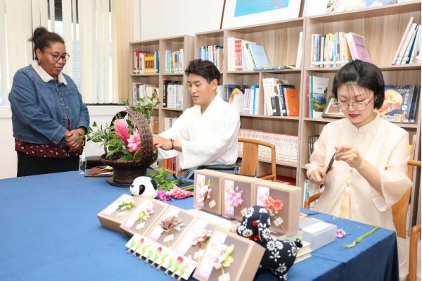 此外,南京剪紙非遺傳承人張鈞還用精湛的技藝現場剪出了斐濟的國花——扶桑花,贏得現場觀眾陣陣掌聲。